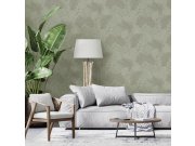 Luxusní vliesové tapety s vinylovém povrchem, plastické motivy listů v odstínech pololesklé zelené a šedo-zelené, hrubší látkové textura. Foto interiéru je pouze ilustrační - odlišné barvy.