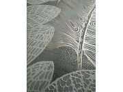 Plastické vliesové tapety na zeď, šedý podklad, listy modré, zelené a metalické.