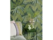 Luxusní zelená vliesové tapety s vinylovém povrchem, hrubší proužkové textura, motiv palem.