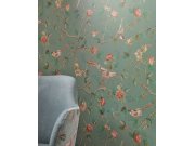 Hladká zelená vliesové tapety na zeď, ptáčci a rozkvetlé větvičky, místy jemné pololesklé detaily.
