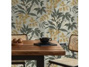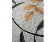 Béžové, jemně strukturované vliesové tapety s vinylovém povrchem, listy v odstínech zelené a hnědé. Foto interiéru je pouze ilustrační - odlišné barvy.