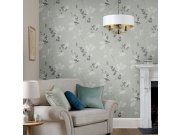 Jemně strukturované vliesové tapety na zeď, odstíny šedé a zelené, na listech metalické linie. Foto interiéru je pouze ilustrační - odlišné barvy.