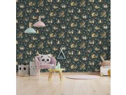 Zelená vliesové tapety na zeď, motivy lesních zvířátek a rostlin. Foto interiéru je pouze ilustrační - odlišné barvy.