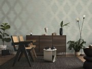 Plastické, šalvějově zelená vliesové tapety na zeď, geometrický vzor, linie v barvě světlého zlata tvoří kosočtverce.