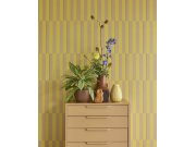 Jemně plastické pruhované vliesové tapety v retro stylu, odstíny žluté a béžové, místy hnědé linie.